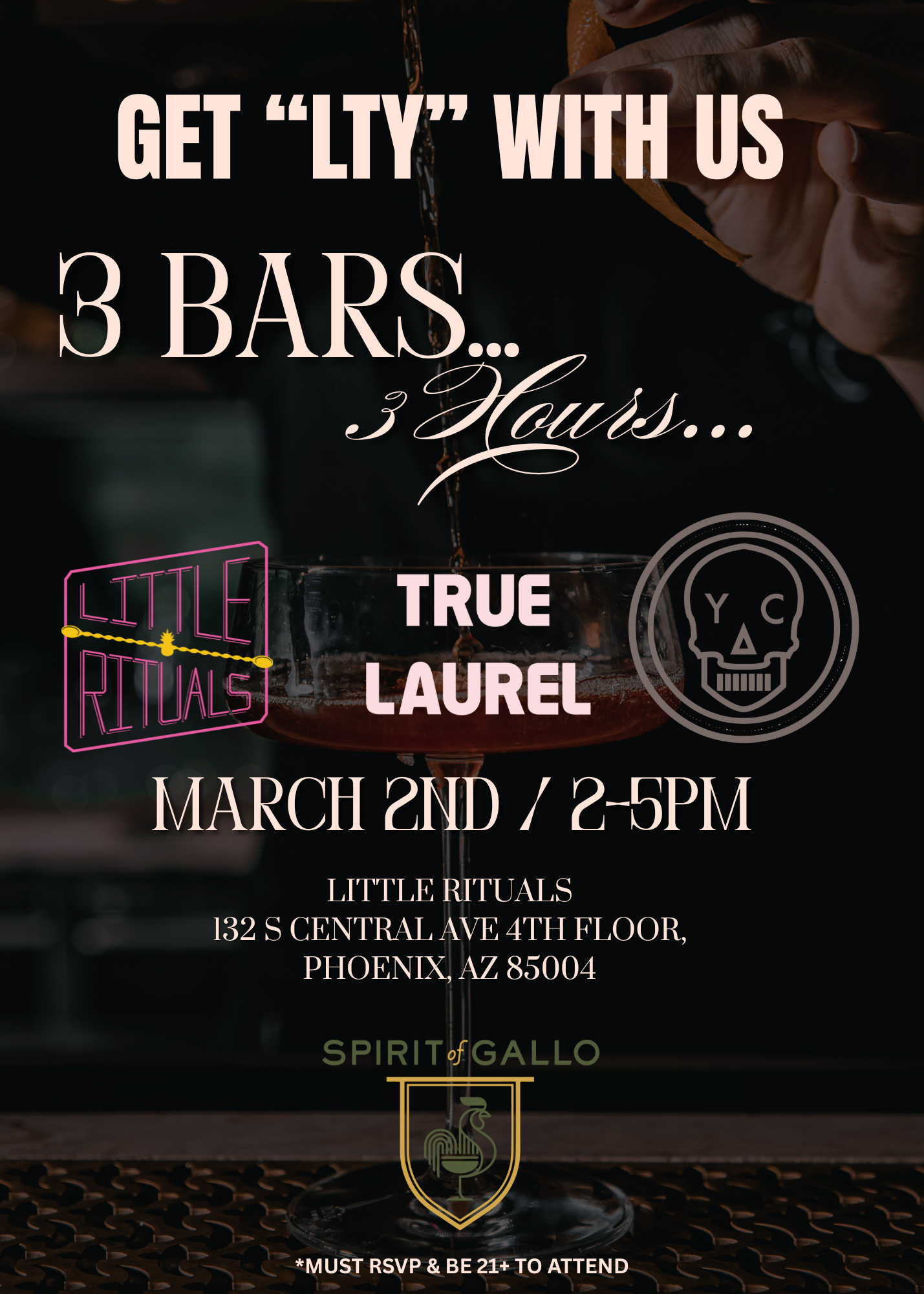Spirit of Gallo Presents: Yacht Club x True Laurel x Little Rituals Monday, March 2, 2026 2:00 PM 5:00 PM 14:00 17:00 Little Rituals 132 South Central Avenue, 4th Floor Phoenix, AZ, 85004 United States (map) Google Calendar ICS Spirit of Gallo will be in the house with two of America’s absolute best bars, Yacht Club and True Laurel, along with Little Rituals for a three-hour experience for the history books! RSVP HERE